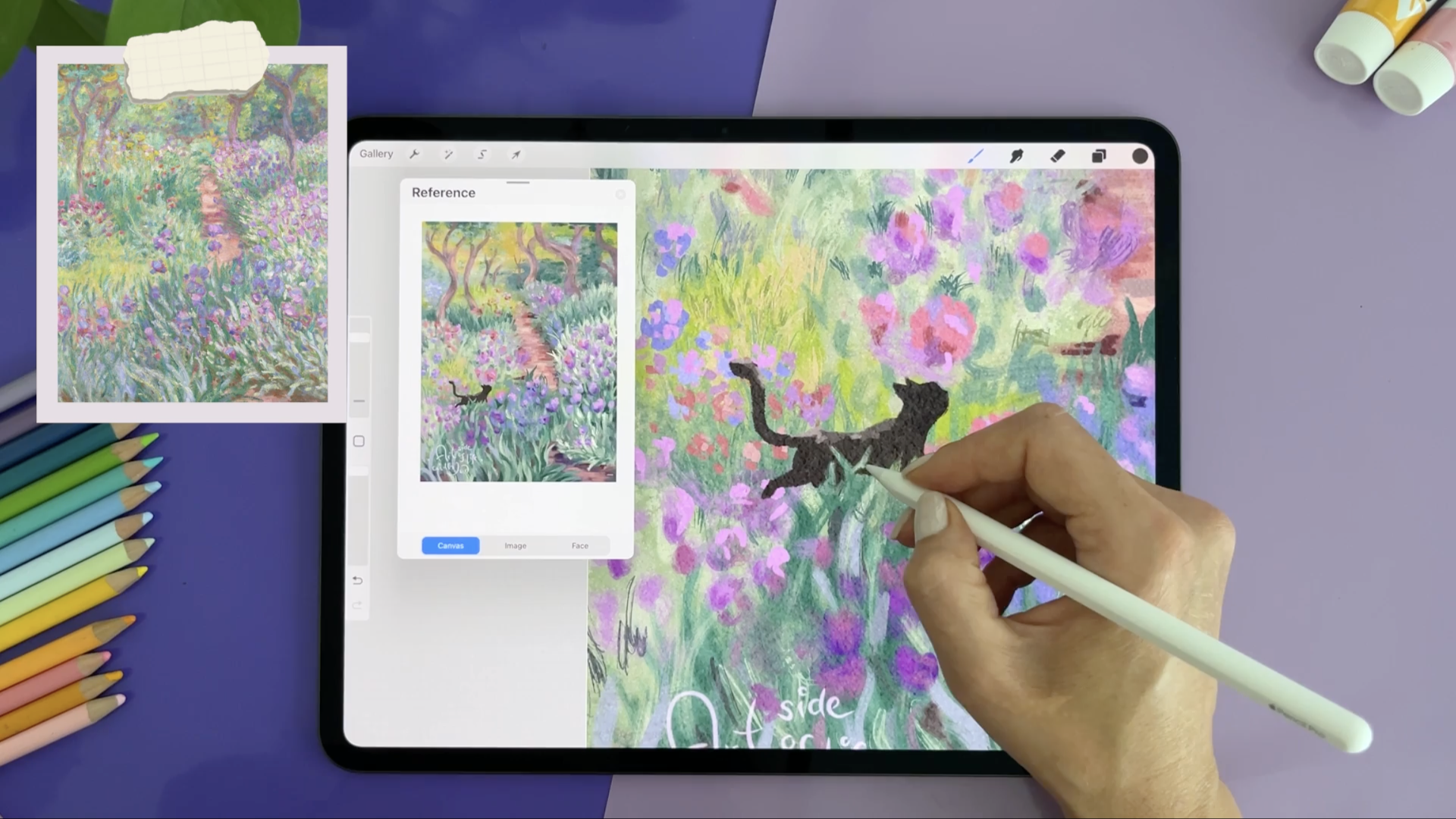 n this speed-up video, I’m following the same process from the tutorial, starting with reference photos, using a limited color palette, and simplifying shapes to focus on clarity.
