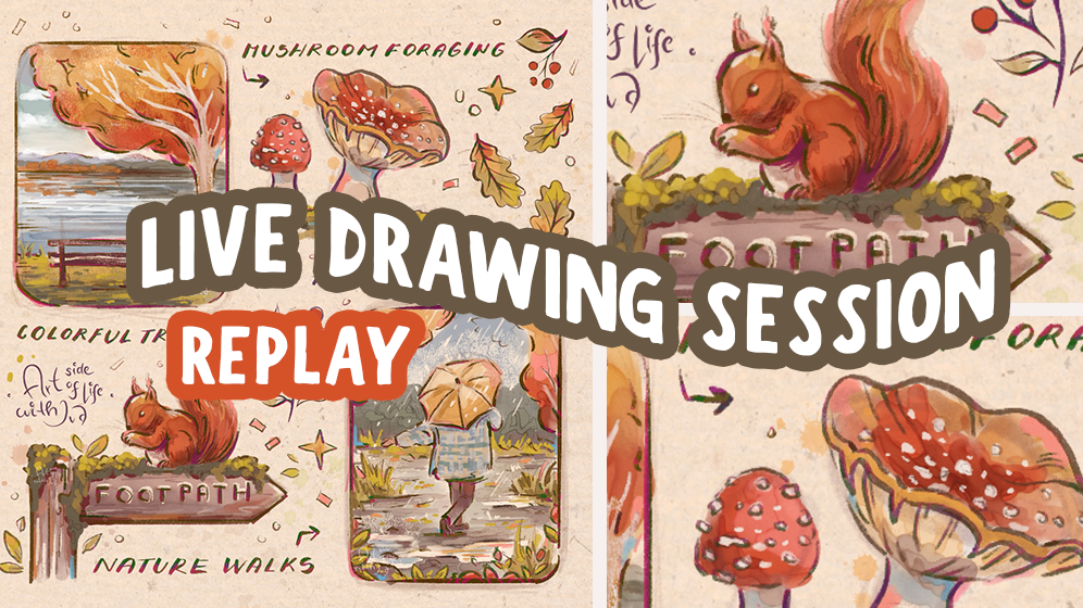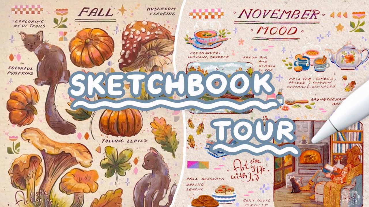 Join us in this month's live drawing sessions with the theme: Autumn Icons and Scenes sketchbook spread